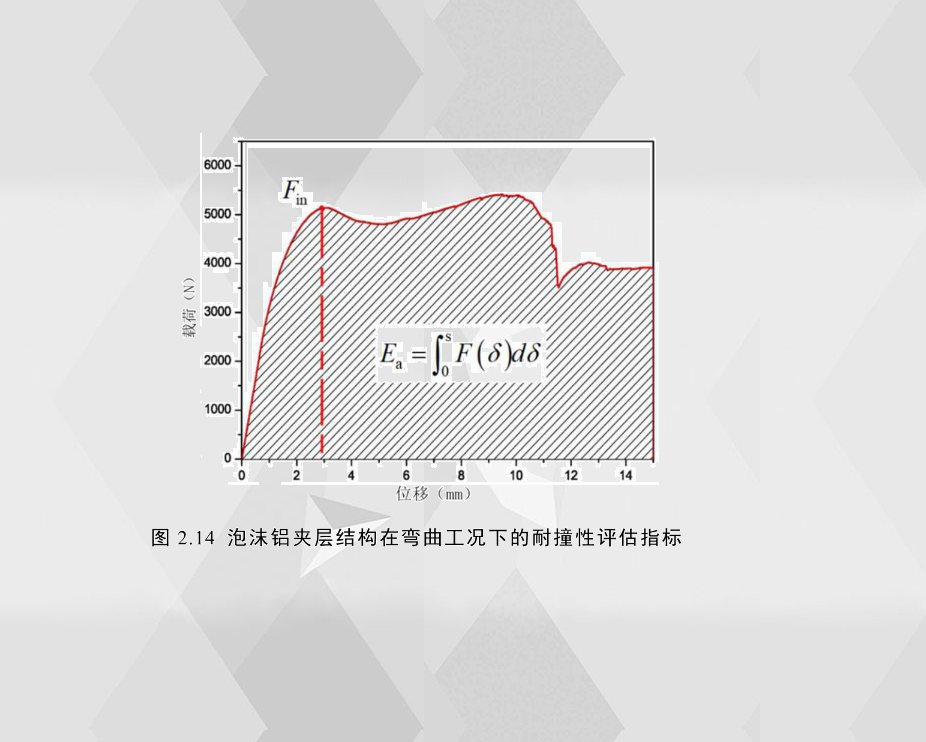 為了量化夾層結(jié)構(gòu)彎曲工況下的耐撞性能,引入四個(gè)評(píng)價(jià)指標(biāo)來(lái)評(píng)估當(dāng)前彎曲實(shí)驗(yàn)夾層結(jié)構(gòu)的耐撞性,包括臨界載荷、吸能總量、比吸能和平均載荷。圖2.14是夾層結(jié)構(gòu)在彎曲工況下的載荷-位移曲線,部分指標(biāo)如圖中所示。