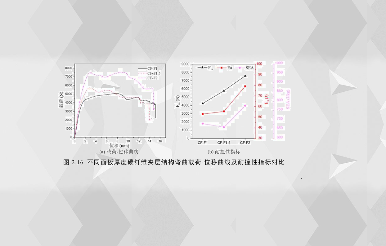 圖2.16(b)比較了不同面板厚度碳纖維夾層結構的耐撞性指標。面板厚度從4層增加到8層(即1mm到2mm),其臨界載荷提高了78.62%,總吸能提高了49.3%,比吸能提高了14.19%。通過比較CF-F1與CF-F1.5臨界載荷之后載荷的變化可以看出,失效模式為壓痕壓入的CF-F1,其載荷在臨界載荷之后較長一段位移(2-4mm)內仍是上升的,而CF-F1.5的載荷是下降的;雖然面板厚度增加了,但其吸能增加的不大,只有4.5%,值得注意的是,由于CF-F1.5重量的增加,總吸能增多的不多,使得CF-F1.5的比吸能比CF-F1要低,這對耐撞性不免是一個損失。