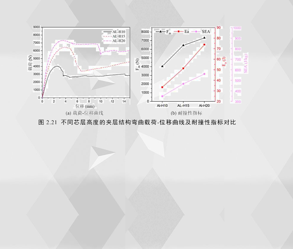 為了研究芯層對夾層結構力學性能的影響,分別比較了不同芯層高度和不同芯層密度的鋁合金夾層結構的載荷-位移曲線及耐撞性指標,如圖2.21和圖2.22所示。芯層高度為10mm的AL-H10和芯層高度為15mm的AL-H15的載荷位移曲線屬于類型I,芯層高度為20mm的AL-H20的屬于類型Ⅱ;AL-H10的臨界失效模式為下界面分離(DB),AL-H15的臨界失效模式為芯層剪切(CS),AL-H20臨界失效模式為壓痕壓入(IN)。從耐撞性指標圖中可以看出,試件的芯層高度從10mm到20mm,其臨界失效載荷、總吸能和比吸能分別提高了81.27%、120.97%和60.68%,因此,鋁合金夾層結構的臨界載荷、總吸能和比吸隨芯層厚度而增加,其臨界失效模式從界面分離(DB)轉為芯層剪切(CS)再到壓痕壓入(IN)。表2.7總結了三種芯層高度的鋁合金夾層結構具體的臨界載荷、總吸能、比吸能和平均載荷值。
