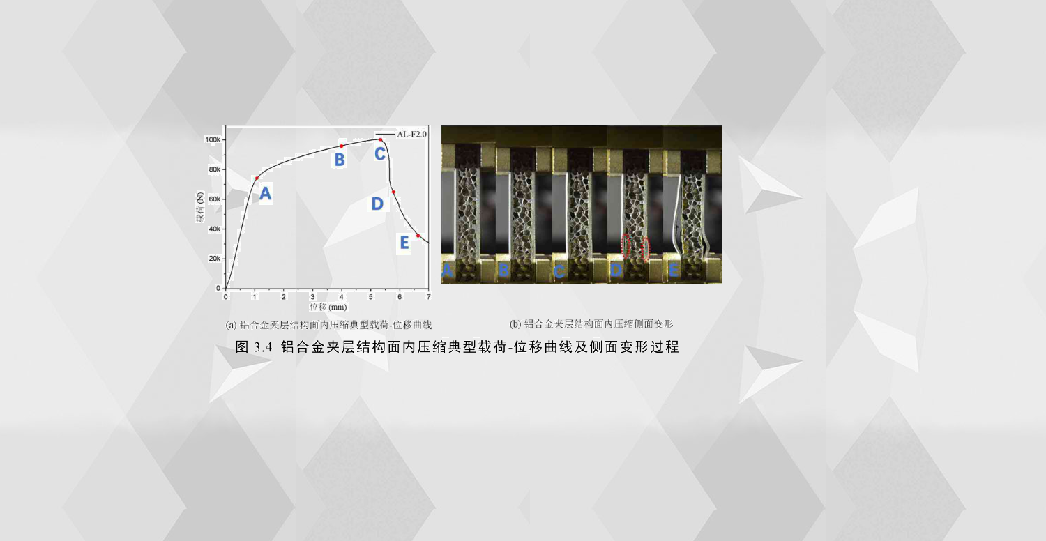 圖3.4(a)描繪了鋁合金夾層結(jié)構(gòu)在面內(nèi)壓縮下典型載荷-位移曲線,其壓潰過(guò)程大體可以分為三個(gè)階段,O-A彈性階段,此階段結(jié)構(gòu)處于彈性變形,載荷與位移的關(guān)系為線性增長(zhǎng);A-C塑性階段,在此階段結(jié)構(gòu)面板受到較大的壓力而產(chǎn)生塑性變形,載荷與位移仍近似呈線性增長(zhǎng)趨勢(shì),只是載荷增長(zhǎng)幅度遠(yuǎn)小于彈性階段增長(zhǎng)幅度;C之后屬于后屈曲階段,由于在此階段面板發(fā)生嚴(yán)重屈曲變形,并且面板與芯層之間的膠層出現(xiàn)大面積失效,這導(dǎo)致夾層結(jié)構(gòu)的承載能力大大降低,此外,由于泡沫芯層壓縮的效果,在面板失穩(wěn)之后夾層結(jié)構(gòu)仍有較弱的承載能力,并未完全失去承載能力,圖3.4(b)為此試件在圖3.4(a)各點(diǎn)時(shí)刻側(cè)面面板與芯層泡沫的變形圖。