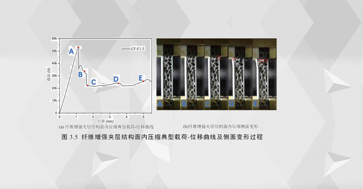 對于面板為纖維增強復合材料(碳纖維和玻璃纖維)的夾層結構而言,其載荷-位移曲線和變形/失效與鋁合金夾層結構的有很大的差異。以面板厚度約1.5mm 的碳纖維夾層結構為例,其載荷-位移曲線大致可以分成兩個階段,如圖3.5(a)所示,第一階段為彈性階段O-A,與鋁合金夾層結構的曲線第一階段相似,載荷隨位移的增加而基本呈線性增長;第二階段為A點之后,隨著壓潰位移的增加,碳纖維面板發(fā)生脆性斷裂,導致載荷發(fā)生斷崖式下降,由于加載位移較小,芯層泡沫未發(fā)生嚴重的破壞,使得纖維增強夾層結構仍具有一定的承載能力。